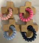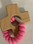 Wooden cross teether. Available in four colors: light blue, medium blue, light pink, and medium pink