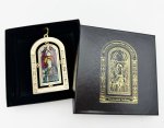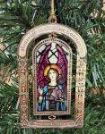 Historical 3-D Ornament depicting the Guardian Angel window at Monastery Immaculate Conception in Ferdinand, Indiana. 2 1/4" wide, 3 5/8" tall. In a black deluxe gift box and includes a paper with information about the Sisters of St. Benedict and their stained glass windows.