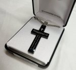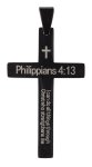 "I Can Do All Things" cross necklace with 24" chain. Black powder coated finish. Deluxe gift boxed. Sentiment: Philippians 4:13 I can do all things through Christ who strengthens me.