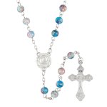 - Features splatter-style marbled multicolor beads and traditional silver-tone crucifix